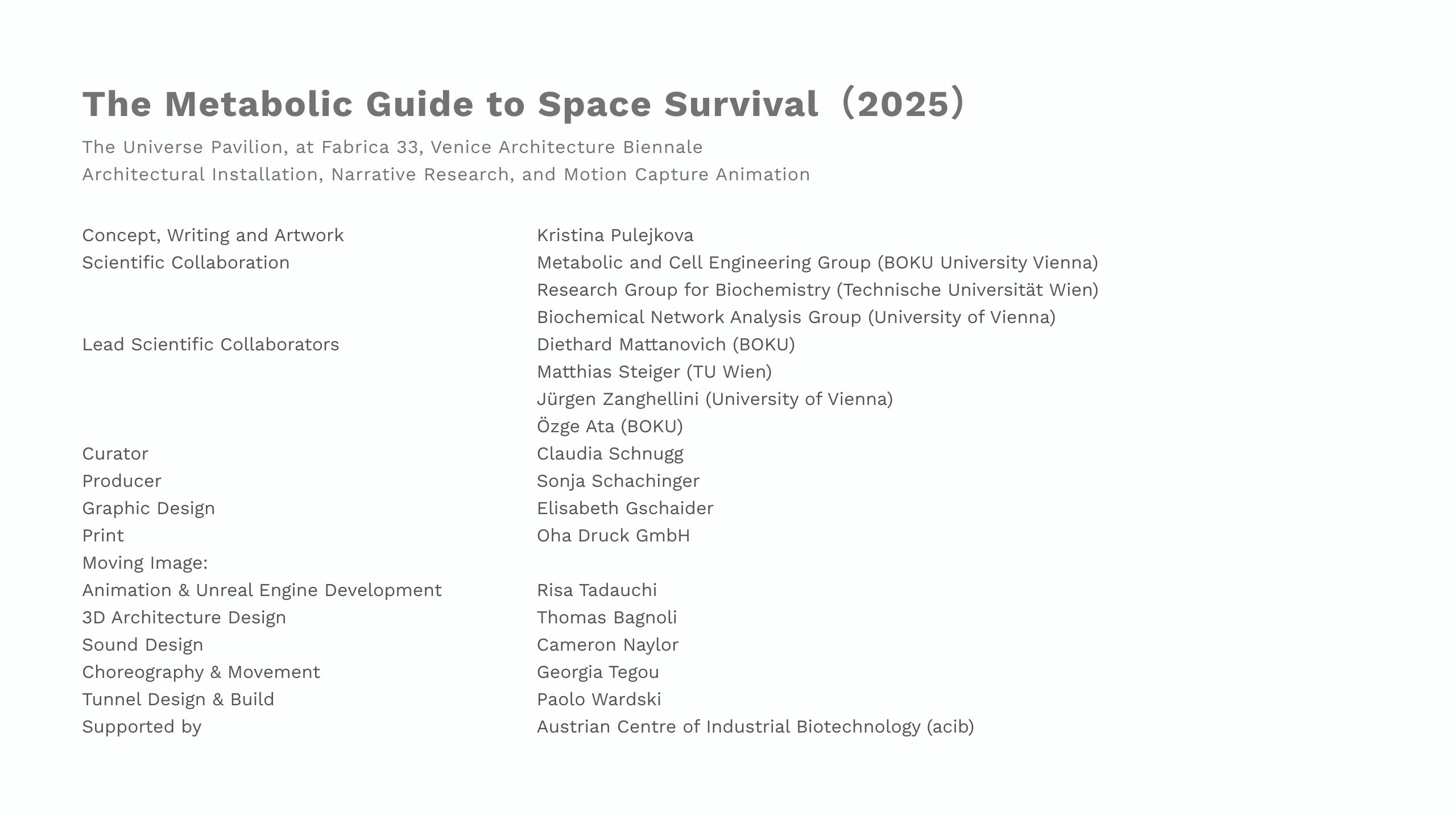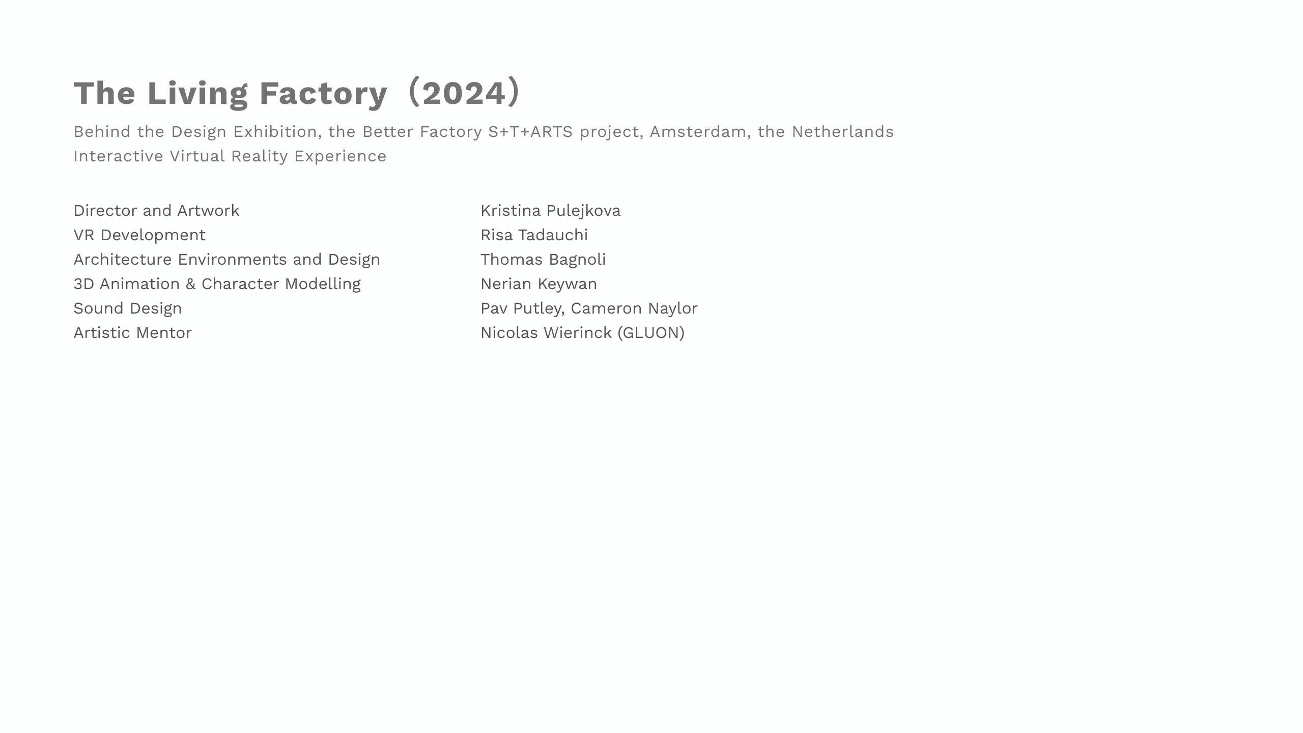 Risa Tadauchi is an XR developer with a background in architecture.Her practice explores the intersection of philosophy and technology, focusing on ontology, user-centred design, and collective world-building. Since 2017, she has used real-time simulation tools as core methods, applying them to VR development, prototyping, motion capture, and installations.She specialises in mediating the realisation of immersive projects, developing project-dependent workflows that connect creators, design, and audiences. Her collaborations span multiple disciplines, including art, engineering, and science. In 2024–25 she collaborated on the immersive artworks The Living Factory and The Metabolic Guide to Space Survival.From 2017–2023 she was part of Zaha Hadid Virtual Reality Group, contributing to Spatial Matrix (2018), Project Correl (2019), New Worlds (2022), and SuperChalet VR (2023). In 2022 she joined the EU-funded Horizon 2020 project PrismArch as a VR researcher and co-authored publication chapters on cybernetic architecture.She holds an M.Arch from the Bartlett School of Architecture, UCL, and a B.A. from Oxford Brookes University. Her collaborative work has been exhibited internationally at the Venice Architecture Biennale, Dongdaemun Design Plaza (Seoul), Museo Universitario Arte Contemporáneo (Mexico City), and the Gallery at Arts University Bournemouth, among others.Her personal practices in tanka (Japanese poetry) and dance have shaped her understanding of user-centred design, as well as the aesthetics of rhythm and motion in real-time content.